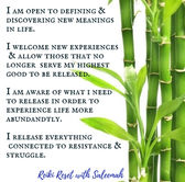 Our Reiki Reset affirmation statements complement the spiritual, mental, and physical healing ignited by your Reiki session. These personalized affirmations help you focus on acknowledging, visualizing, vocalizing, and taking conscious action to alleviate unproductive behavior patterns.